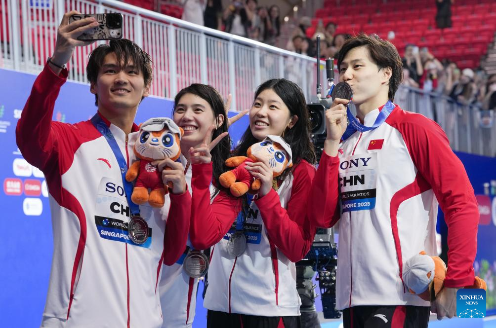 This file photo taken on July 30, 2025 shows team China's Xu Jiayu, Zhang Yufei, Wu Qingfeng and Qin Haiyang (L to R) taking selfies after the awarding ceremony for the mixed 4x100m medley relay event of swimming at the World Aquatics Championships in Singapore. (Xinhua/Wu Zhizun)