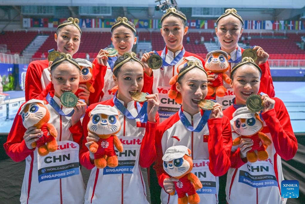 This file photo taken on July 22, 2025 shows gold medalists team China posing after the awarding ceremony for the team technical event of artistic swimming at the World Aquatics Championships in Singapore. (Xinhua/Xia Yifang)