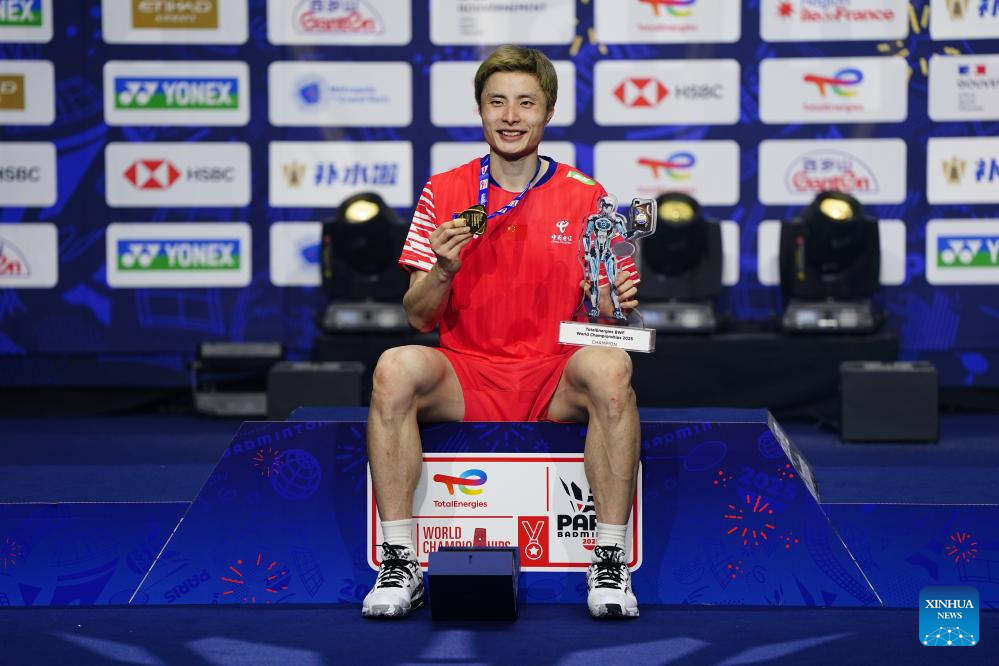 This file photo taken on Aug. 31, 2025 shows gold medalist China's Shi Yuqi posing during the awarding ceremony for the men's singles event at the BWF World Championships 2025 in Paris, France. (Xinhua/Peng Ziyang)