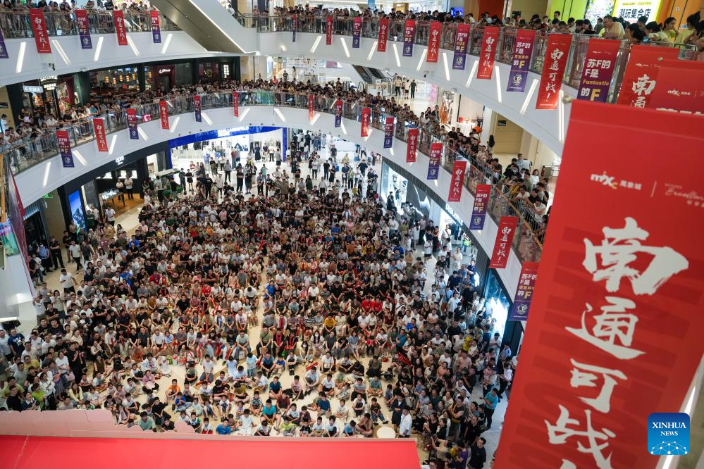 This file photo taken on June 29, 2025 shows people watching the 2025 Jiangsu Football City League live match on a giant screen inside a shopping mall in Nantong, east China's Jiangsu Province. (Xinhua/Li Bo)
