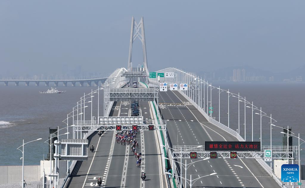 This file photo taken on Nov. 8, 2025 shows cyclists competing across the Hong Kong-Zhuhai-Macao Bridge during the men's road race of cycling road at China's 15th National Games in south China's Guangdong Province. (Xinhua/Liang Xu)