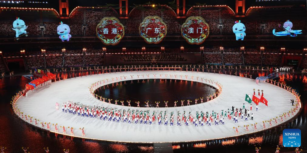 This file photo taken on Nov. 9, 2025 shows members of Guangdong, Hong Kong and Macao delegations parading during the opening ceremony of China's 15th National Games in Guangzhou, south China's Guangdong Province. (Xinhua/Lu Hanxin)