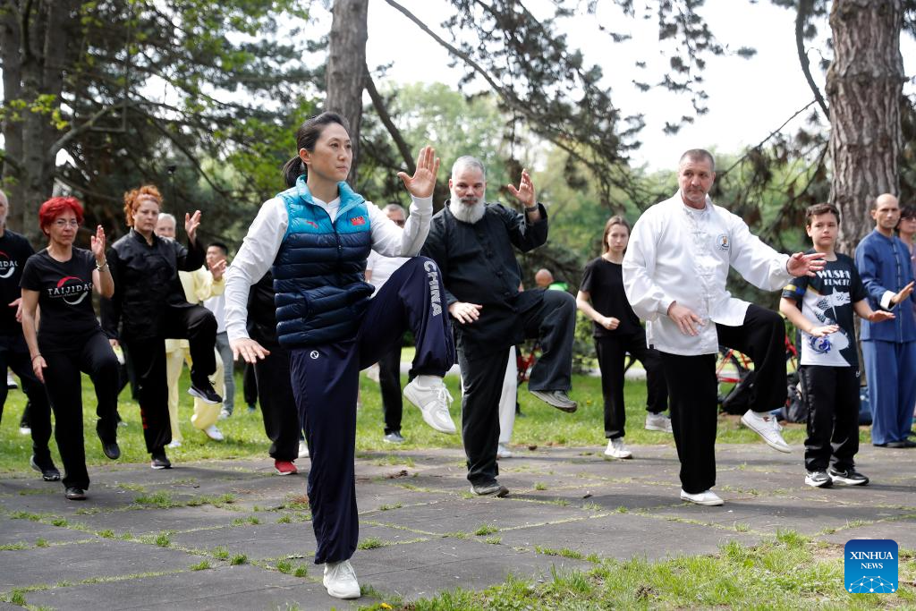 This file photo taken on April 26, 2025 shows Li Fengmei (front), associate professor of China's Capital University of Physical Education and Sports, practicing Tai Chi with local people in Bucharest, Romania. (Photo by Cristian Cristel/Xinhua)