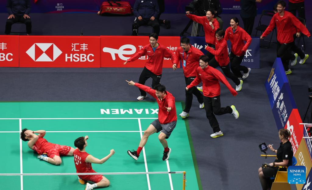 This file photo taken on May 4, 2025 shows members of team China celebrating after winning the final match against South Korea at BWF Sudirman Cup in Xiamen, southeast China's Fujian Province. (Xinhua/Wang Kaiyan)