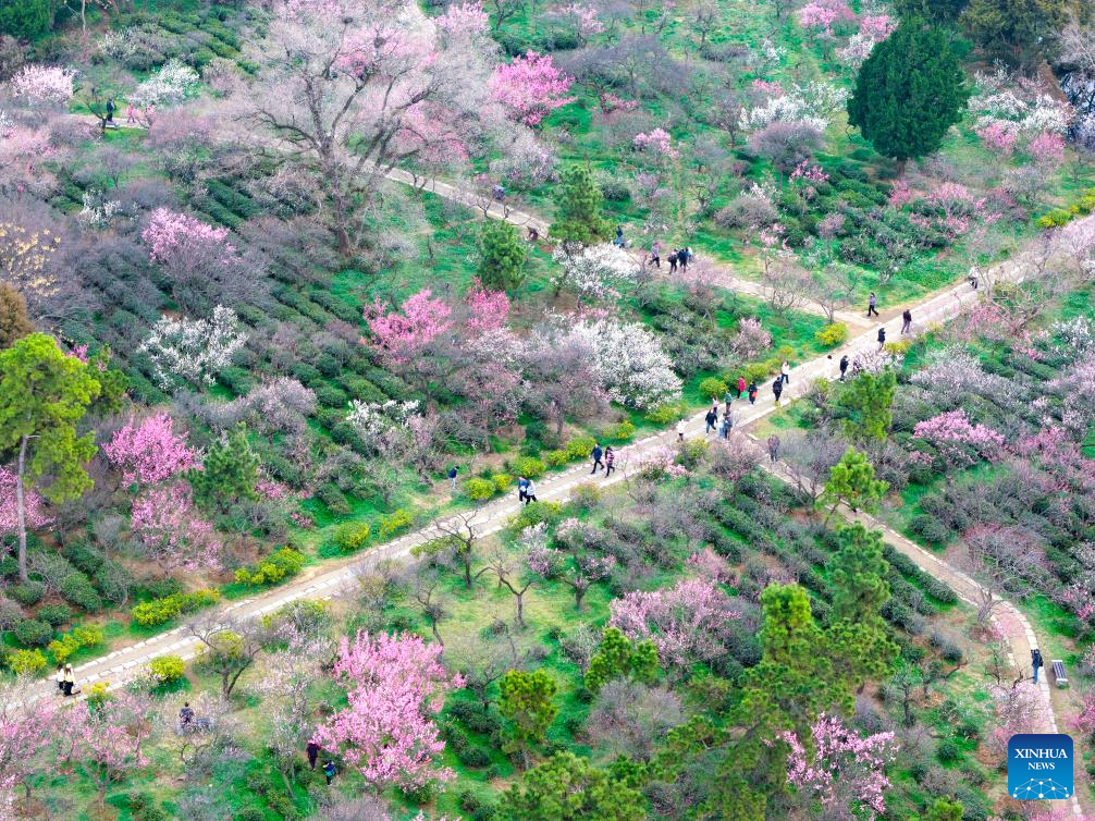 An aerial drone photo taken on Feb. 25, 2026 shows tourists visiting the Meihua Mountain at the imperial Xiaoling Mausoleum scenic area of Nanjing, east China's Jiangsu Province. (Photo by Yang Suping/Xinhua)