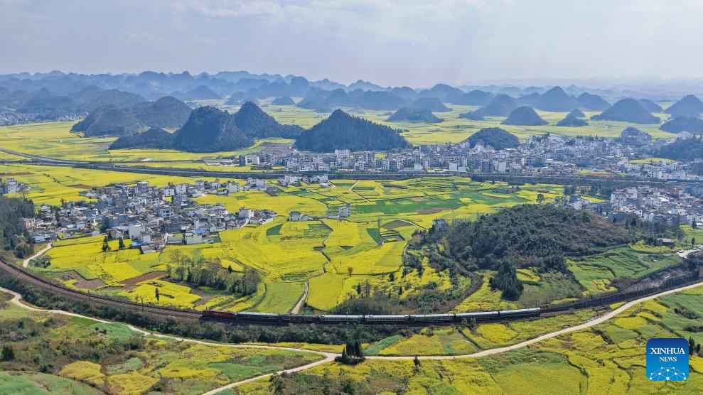 An aerial drone photo taken on Feb. 26, 2026 shows a tourist train running past rapeseed flower fields in Luoping County in Qujing, southwest China's Yunnan Province. (Photo by Yang Zixuan/Xinhua)