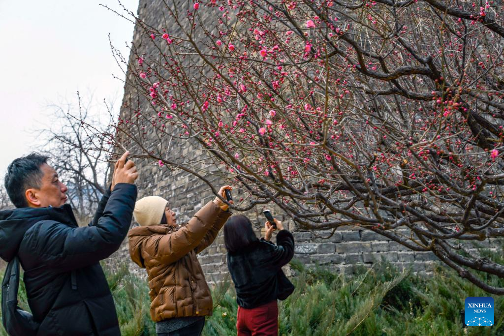 Tourists take photos of flowers at the Ming Dynasty city wall ruins park in Beijing, capital of China, on Feb. 26, 2026. (Photo by Liu Mancang/Xinhua)