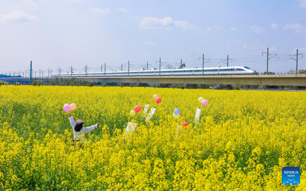 A tourist visits a rapeseed flower field as a high-speed train runs past in Longmatan District of Luzhou, southwest China's Sichuan Province, on Feb. 26, 2026. (Photo by Mou Ke/Xinhua)