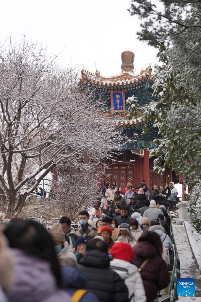 Tourists visit the Jingshan Park after a snowfall in Beijing, capital of China, March 5, 2026. Beijing has witnessed a spring snowfall from Wednesday to Thursday. (Xinhua/Xie Han)