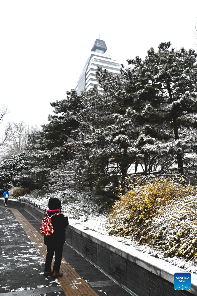 Citizens walk on a street in Beijing, capital of China, on March 5, 2026. Beijing has witnessed a spring snowfall from Wednesday to Thursday. (Xinhua/Li Xin)