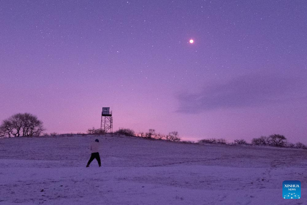 A citizen photographs a total lunar eclipse over Qiqihar City, northeast China's Heilongjiang Province, March 3, 2026. Tuesday marked the Lantern Festival, which falls on the 15th day of the first month of the Chinese lunar calendar. This year's festival coincided with a total lunar eclipse. (Photo by Wang Yonggang/Xinhua)