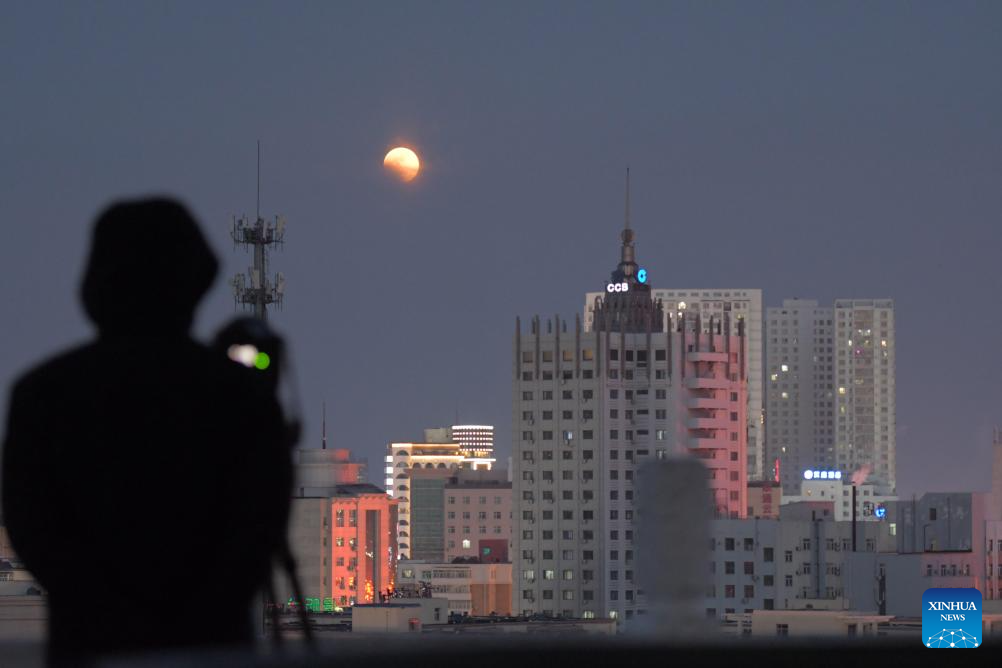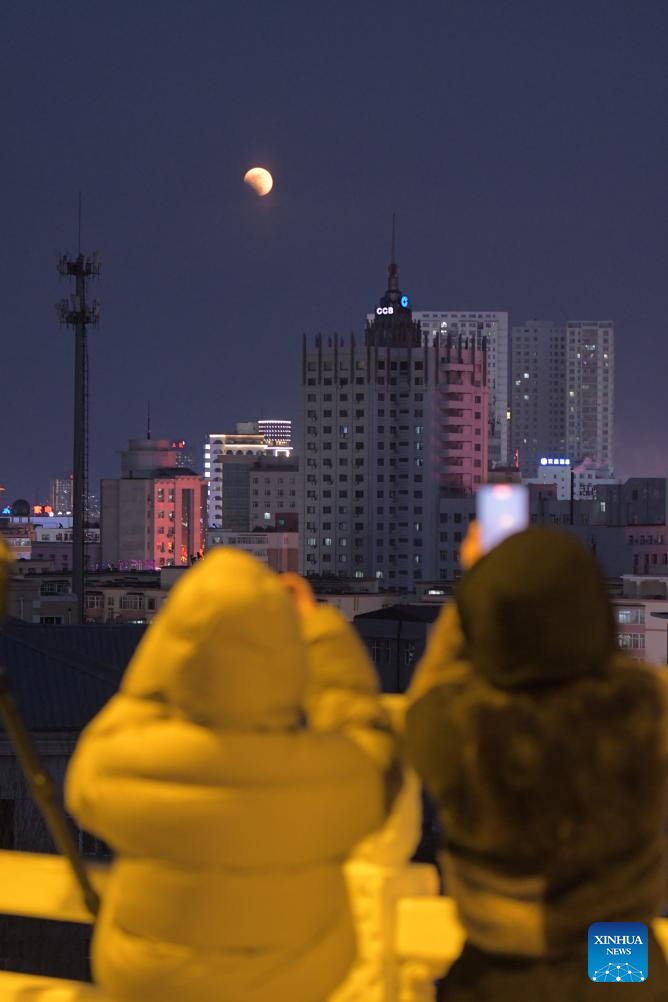 People photograph a total lunar eclipse over Qiqihar City, northeast China's Heilongjiang Province, March 3, 2026. Tuesday marked the Lantern Festival, which falls on the 15th day of the first month of the Chinese lunar calendar. This year's festival coincided with a total lunar eclipse. (Photo by Wang Yonggang/Xinhua)