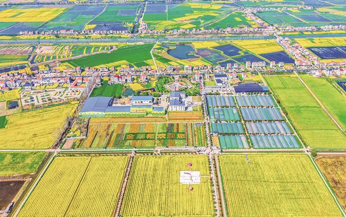 3月13日,金草帽现代农业基地的连片油菜花海景观 通讯员供图 Aerial image on March 13 captures a contiguous sea of rapeseed flowers at the Golden Straw Hat Modern Agricultural BasePicture from correspondents