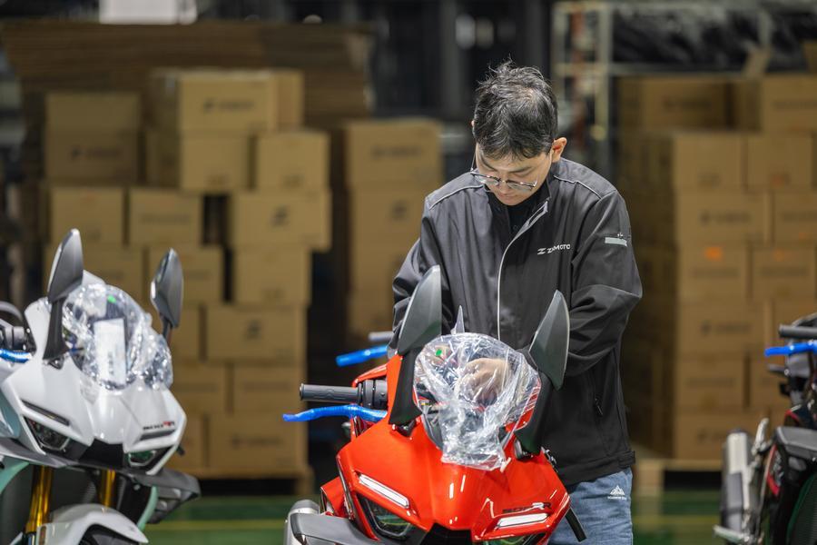 A staff member conducts inspections on a motorcycle at the production workshop of ZXMOTO, April 1, 2026. (Xinhua/Huang Wei)