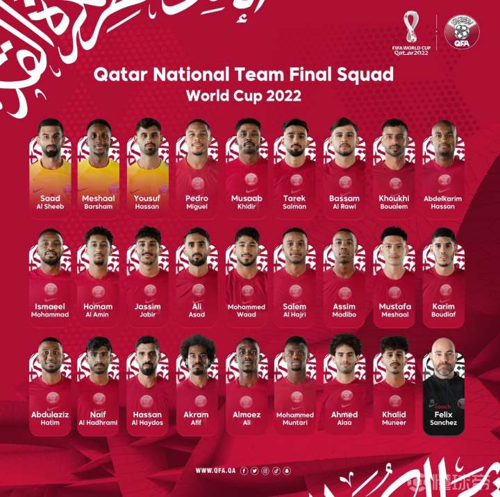 近日,世界杯东道主卡塔尔队公布了参赛球员名单。2019年亚洲杯金靴得主阿尔莫耶茨·阿里领衔,阿菲夫、海多斯等名将在列。卡塔尔队26名球员全部来自本国联赛,其中萨德俱乐部共有13人入选。