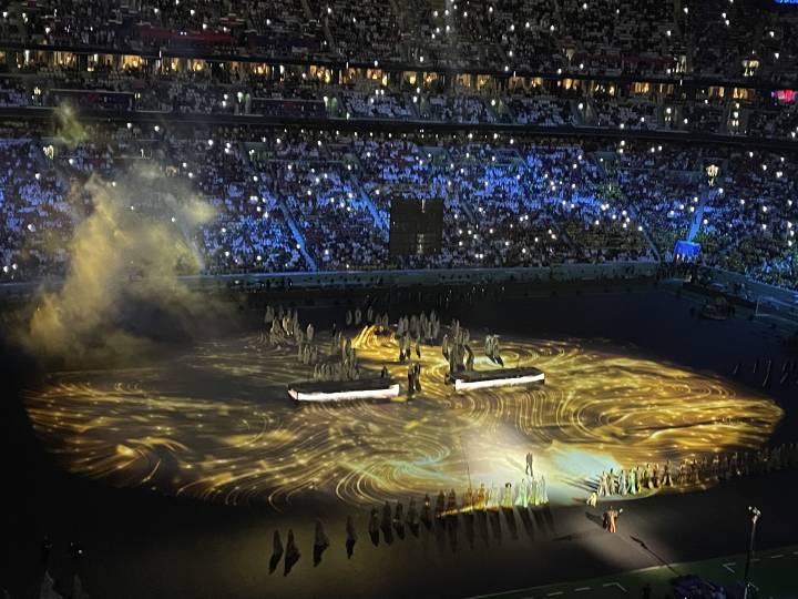开幕式上,德塞利捧着大力神杯入场,著名影星摩根·弗里曼饰演的旅行者与一名卡塔尔残障男孩的对话感染了很多人,最后再由超人气偶像防弹少年团成员完成表演,有过去、也有未来。