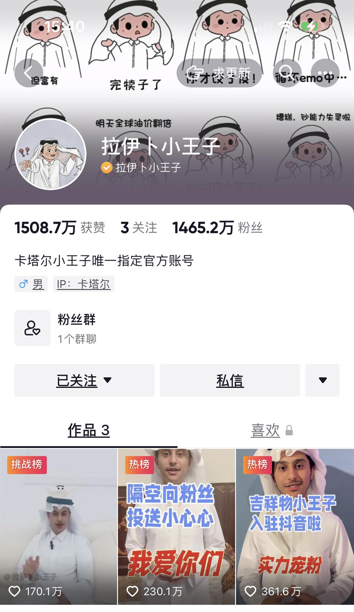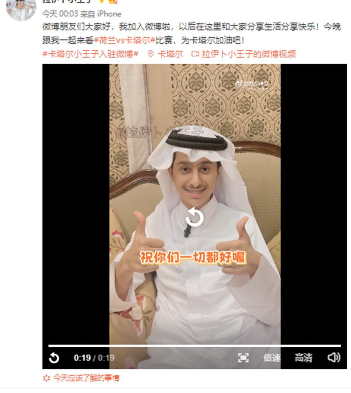 卡塔尔王子阿卜杜勒拉赫曼·法哈德·阿勒萨尼,以“拉伊卜小王子”的名字入驻中国社交媒体。11月27日在当红视频网站上入驻当天,他的粉丝即冲破千万,11月29日他又注册了微博,粉丝也正在不停上升。