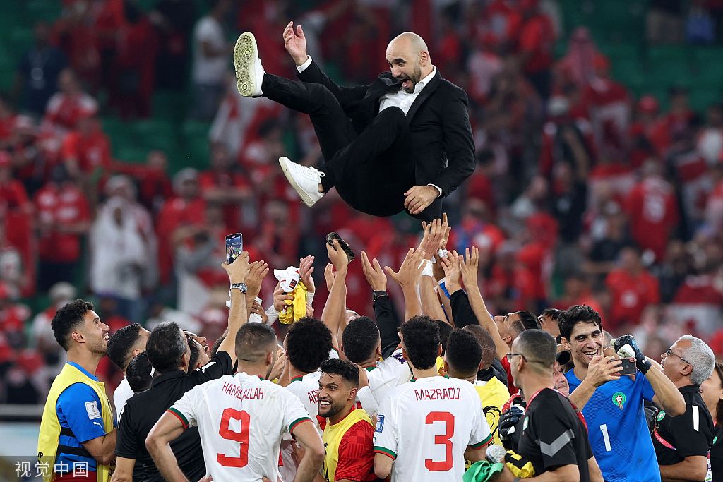 摩洛哥拿下小组第一,球员兴奋地抛起主帅。