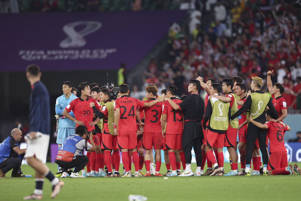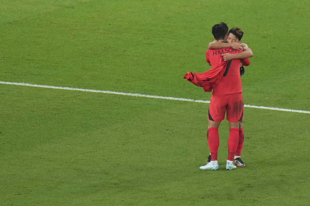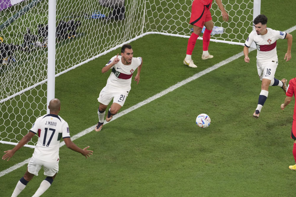 两队在90分钟内战成1:1平。补时开始后不久,韩国队头号球星孙兴民就后场带球突进至对方禁区前沿,在葡萄牙队三名球员的夹防下送出妙传,替补上场的黄喜灿跟进打入一粒价值千金的进球。