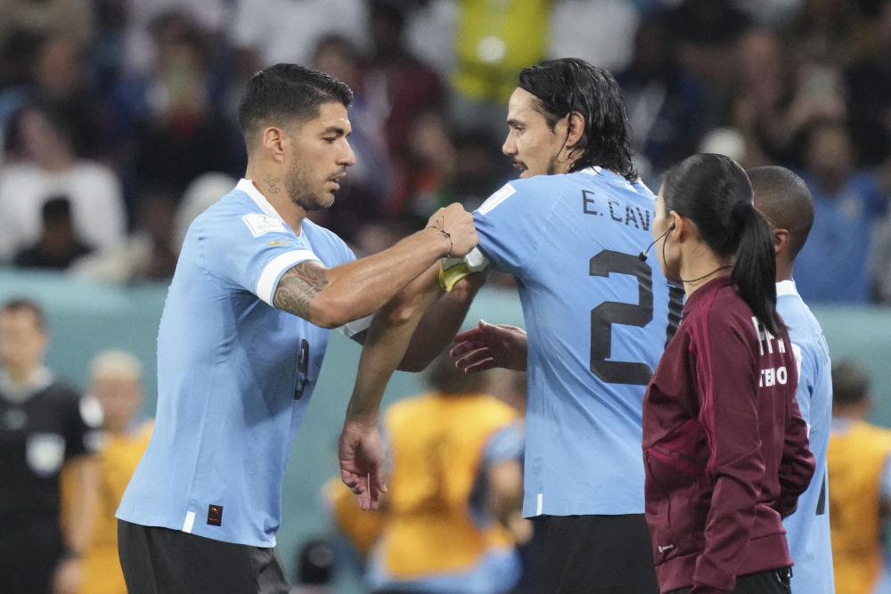 12月2日,乌拉圭队球员路易斯·苏亚雷斯(左一)在比赛中为队友埃丁森·卡瓦尼(左二)戴上队长袖标。新华社记者李钢摄