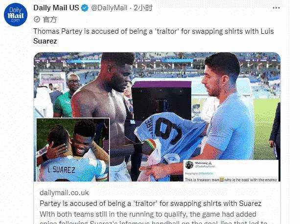 这一次,乌拉圭再次击败了加纳,赛后,托马斯和苏亚雷斯进行了球衣交换,这引起了很多加纳球迷的不满,“这是叛国罪,为什么他对敌人这么冷静。”、“卖国贼。”“他最好把这件球衣烧了。”很明显,加纳球迷把托马斯当成了叛徒。