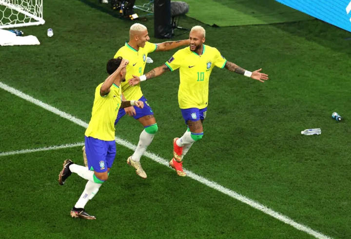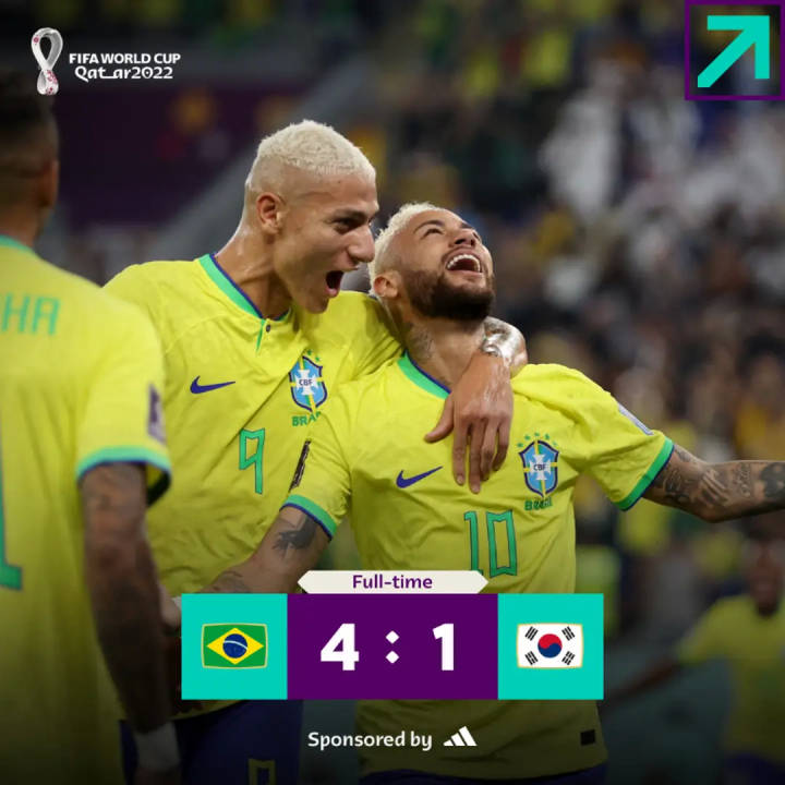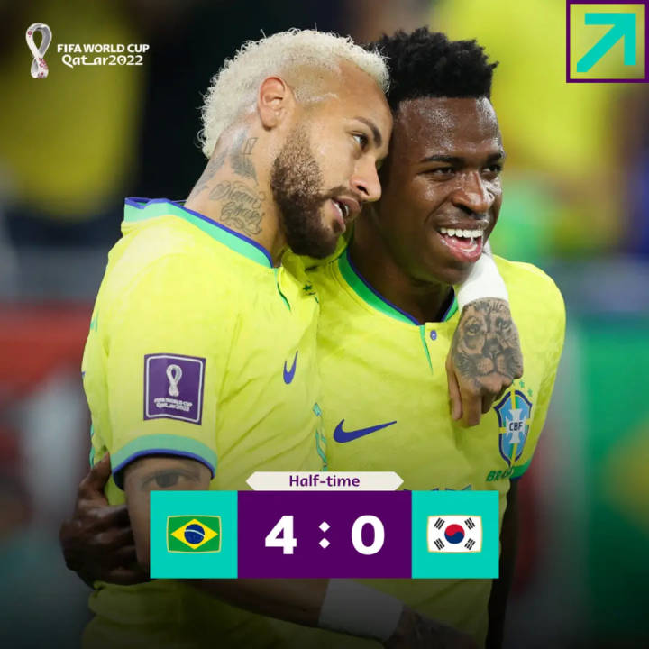 北京时间2022年12月06日03:00,巴西在世界杯1/8决赛迎战韩国,上半场威尼修斯兜射破门,内马尔罚中点球,黄喜灿远射被阿利森扑出,里沙利松轻松推射破门,帕奎塔中路跟进射门,下半场孙兴慜打门被扑,拉菲尼亚连续打门被扑,白昇浩远射世界波扳回一球。最终巴西4-1轻松战胜韩国队,挺进八强,他们将遭遇克罗地亚。