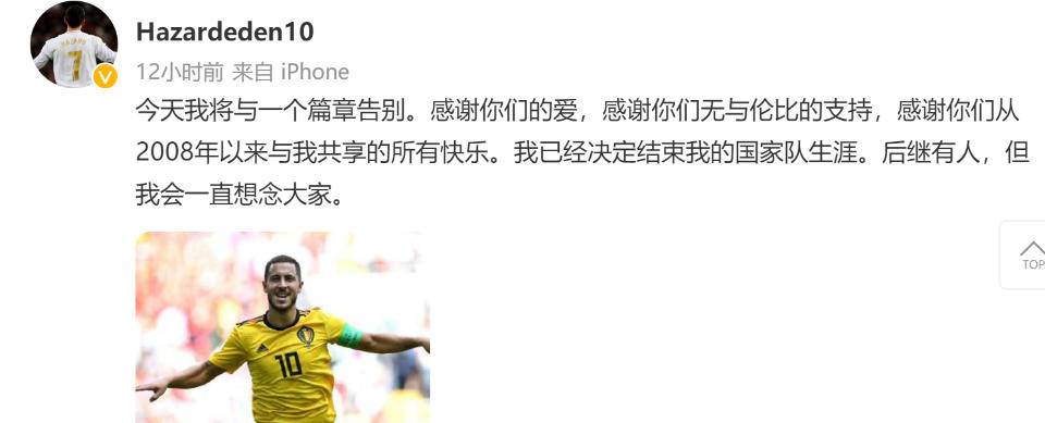 12月7日,现年31岁的比利时国家队队长阿扎尔发文,宣布结束个人国家队生涯,正式从比利时队退役。