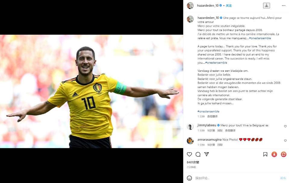 阿扎尔宣布从比利时国家队退役后,他在国家队的队友纷纷向他告别。