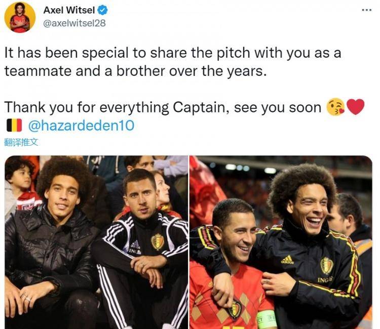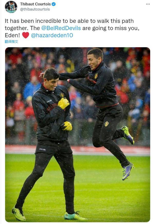 库尔图瓦写道:“和你这一路走来,真的很不可思议。阿扎尔,比利时国家队会想念你的!”
