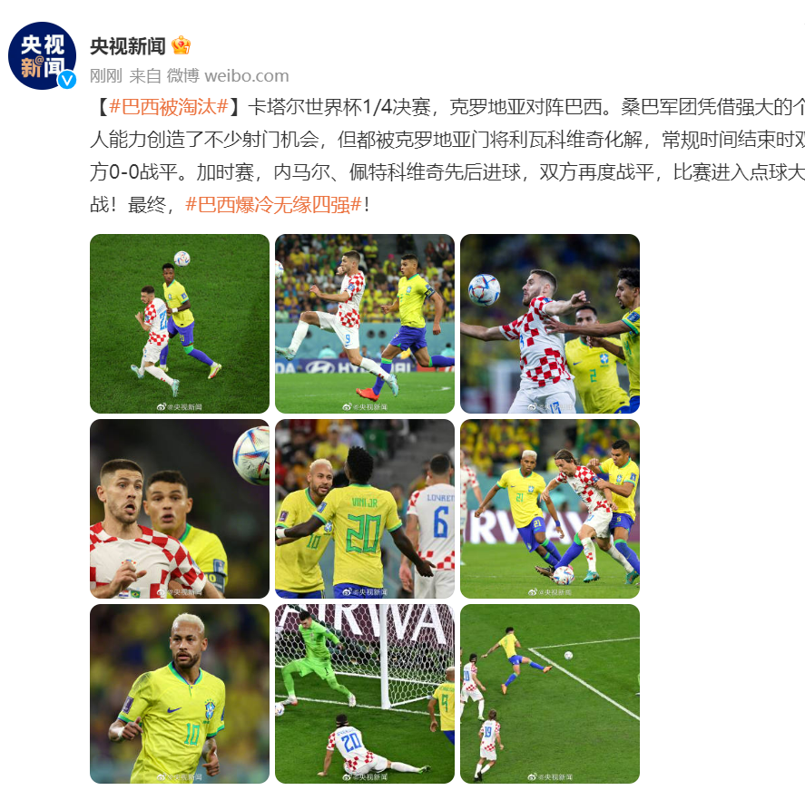 卡塔尔世界杯1/4决赛,克罗地亚对阵巴西。桑巴军团凭借强大的个人能力创造了不少射门机会,但都被克罗地亚门将利瓦科维奇化解,常规时间结束时双方0-0战平。加时赛,内马尔、佩特科维奇先后进球,双方再度战平,比赛进入点球大战!最终,#巴西爆冷无缘四强#!