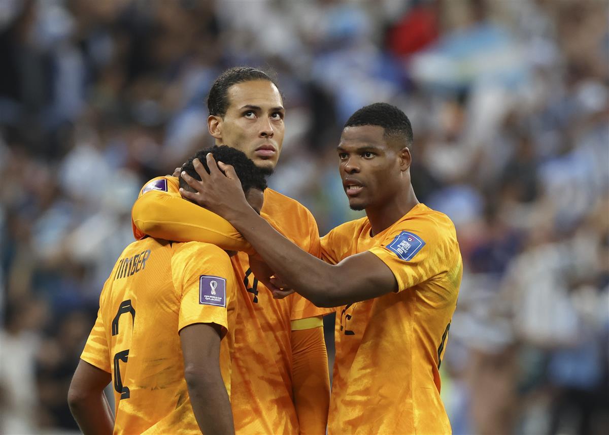 荷兰队球员朱里恩·廷贝尔、范戴克与丹泽尔·邓弗里斯(从左至右)在赛后互相安慰