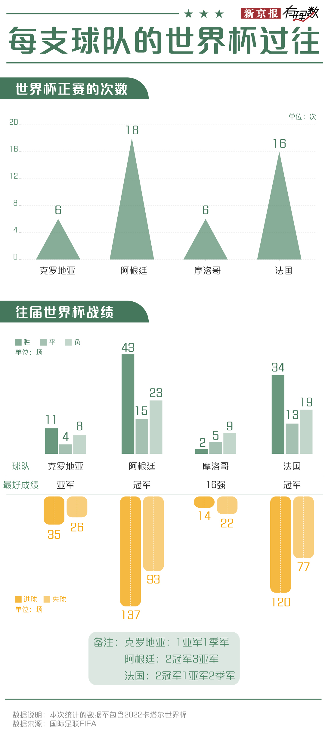 阿根廷和法国参与的次数较多,也都获得过世界杯的冠军;克罗地亚虽然参与的少,但是自从1998年第一次参与后,接下来的几届从未缺席,上一届世界杯还获得了亚军的成绩;而摩洛哥的参与就比较分散了,上一次小组赛出线,还是1986年的墨西哥世界杯。摩洛哥还是唯一进球数少于失球数的球队。