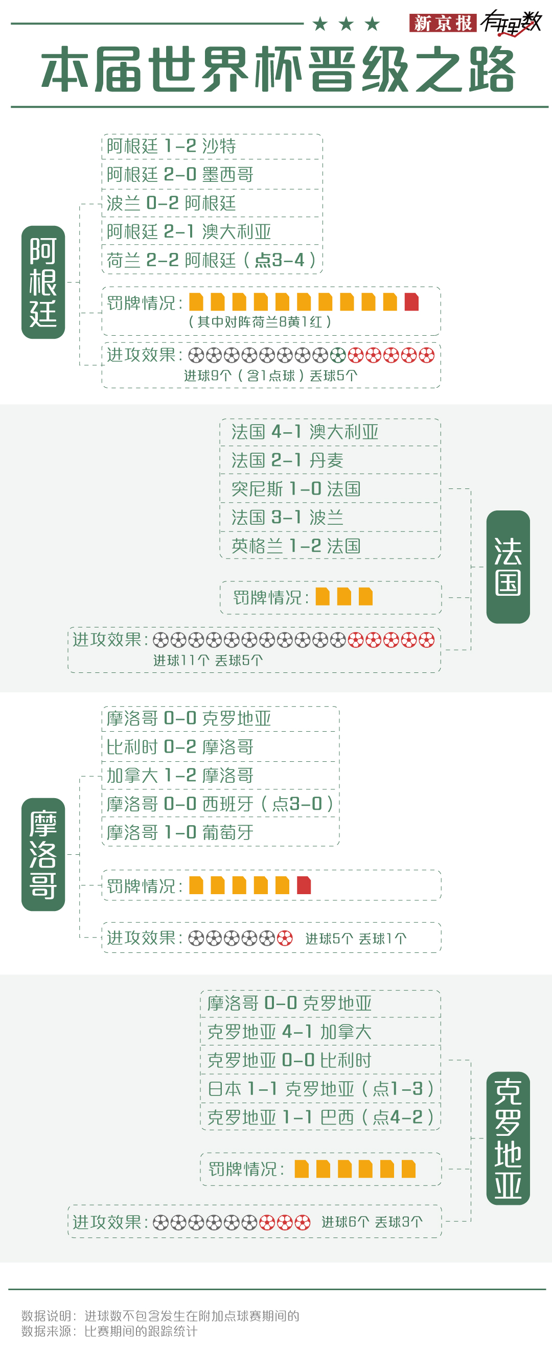 法国队在本届世界杯的整体表现一如既往地稳健,特别是世界足坛第一身价姆巴佩领衔的攻击群。目前还未曾遇到过加时赛的情况,更别说点球了,有法国队的比赛,90分钟内就能解决战斗。