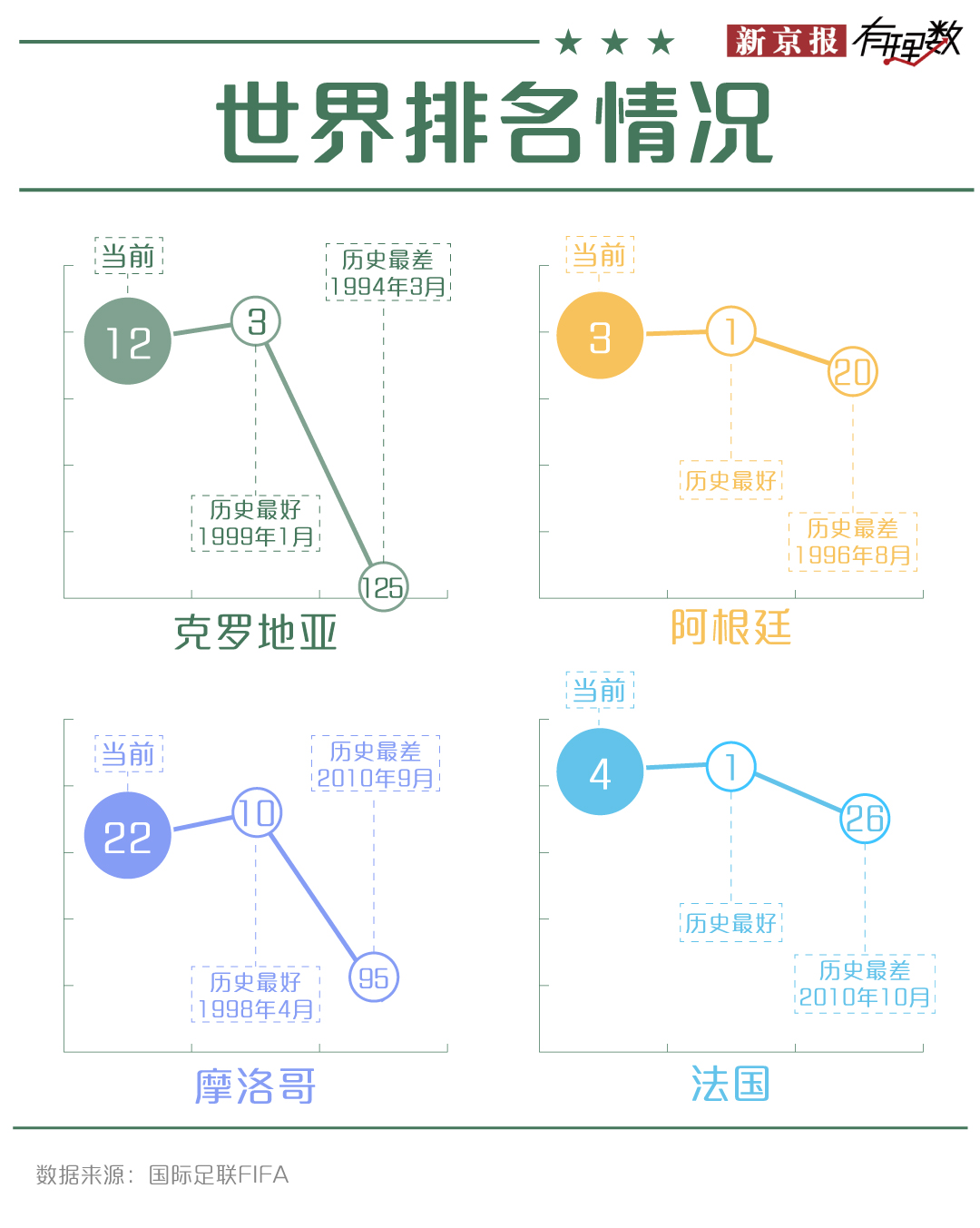 先看世界排名。阿根廷和法国属于第一梯队,并且都曾多次排在过世界第一的位置;克罗地亚的成绩可以说是进步最快,而且还曾经到达过世界第三的高度;而摩洛哥虽然当前的排名在四支球队中算是最弱的,但是不可否认,他们为非洲足球创造了历史。