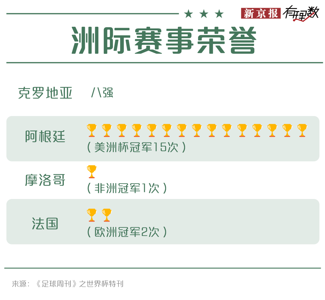 在强手如云的欧洲杯赛场上,克罗地亚还未曾获得过这项荣誉,他们的最好成绩是1996年和2008年的欧洲杯八强;而法国已经拿过两次欧洲杯冠军了;阿根廷在美洲杯的实力毋庸置疑,目前和乌拉圭一起以15个冠军的数量,并列获得该项荣誉最多的国家;我们都说摩洛哥是“黑马”,其实摩洛哥在非洲也是拿过洲际赛事冠军的。