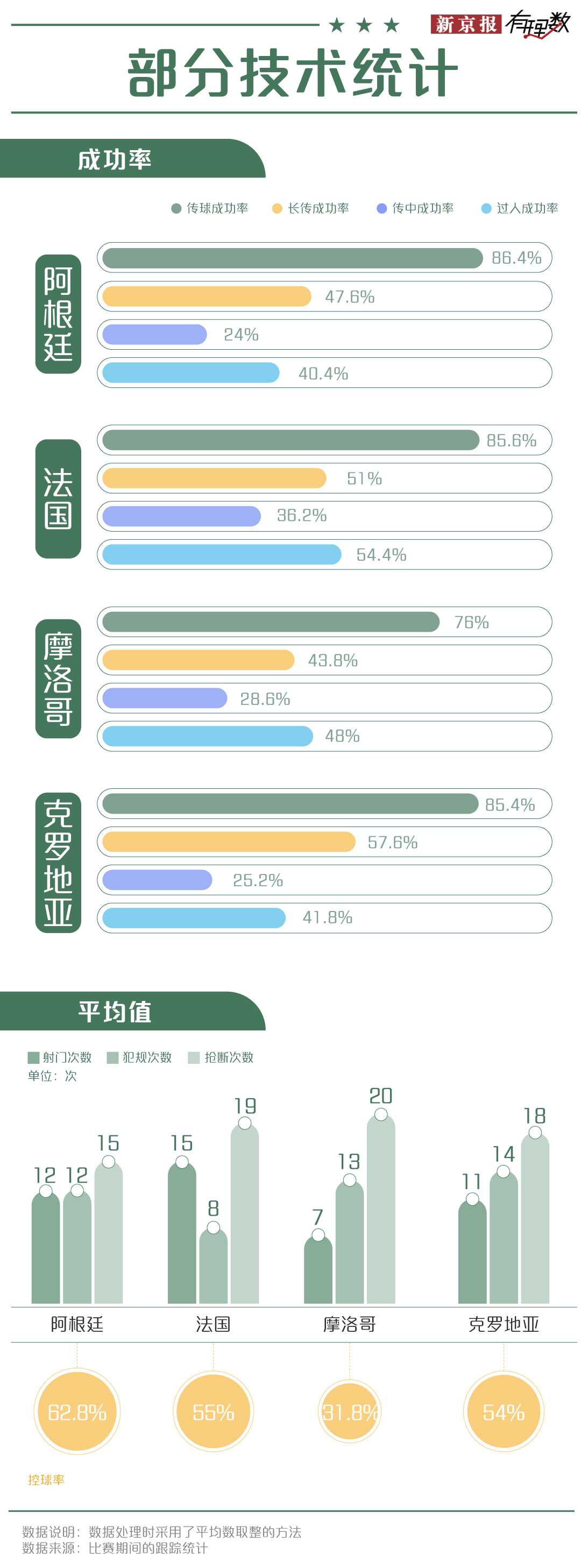 我们再从技术层面看一下:单看传球成功率,阿根廷、法国和克罗地亚不相上下,摩洛哥稍弱。克罗地亚在长传球方面是唯一成功率超过50%的,所以克罗地亚队在球场上大脚转移能力比较突出。另外法国队也有一技之长,那就是他们的过人,所以法国队会给对手在防守上制造麻烦。
