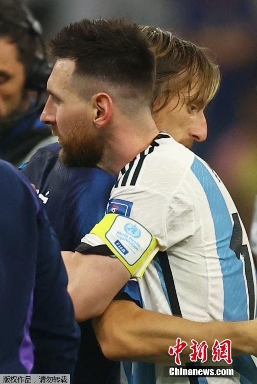 图为赛后梅西与莫德里奇拥抱致意