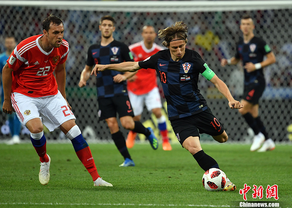 图为克罗地亚队球员莫德里奇(蓝)带球突破