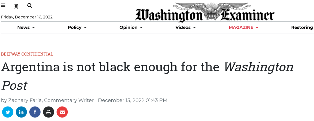 如下图所示,美国右翼民粹报纸《华盛顿审查者报》就把爱德华兹的这篇文章歪曲成了是她“嫌弃”阿根廷队“不够黑”。