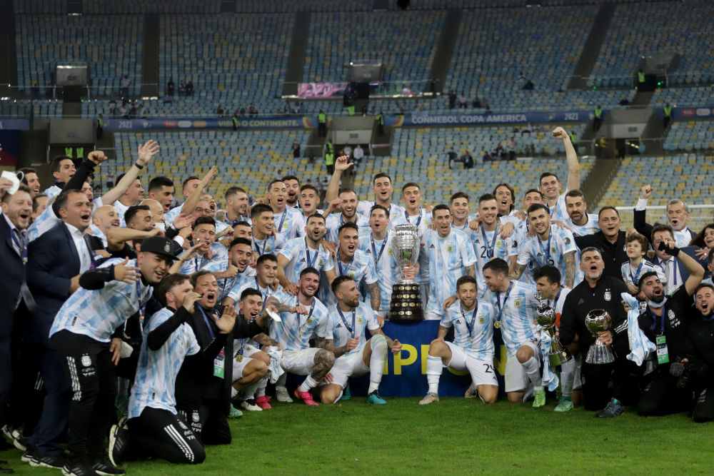 2021年7月10日,阿根廷队在2021年美洲杯决赛后。当日,阿根廷队以1:0战胜巴西队,获得冠军。新华社发(拉赫尔·帕特拉索摄)