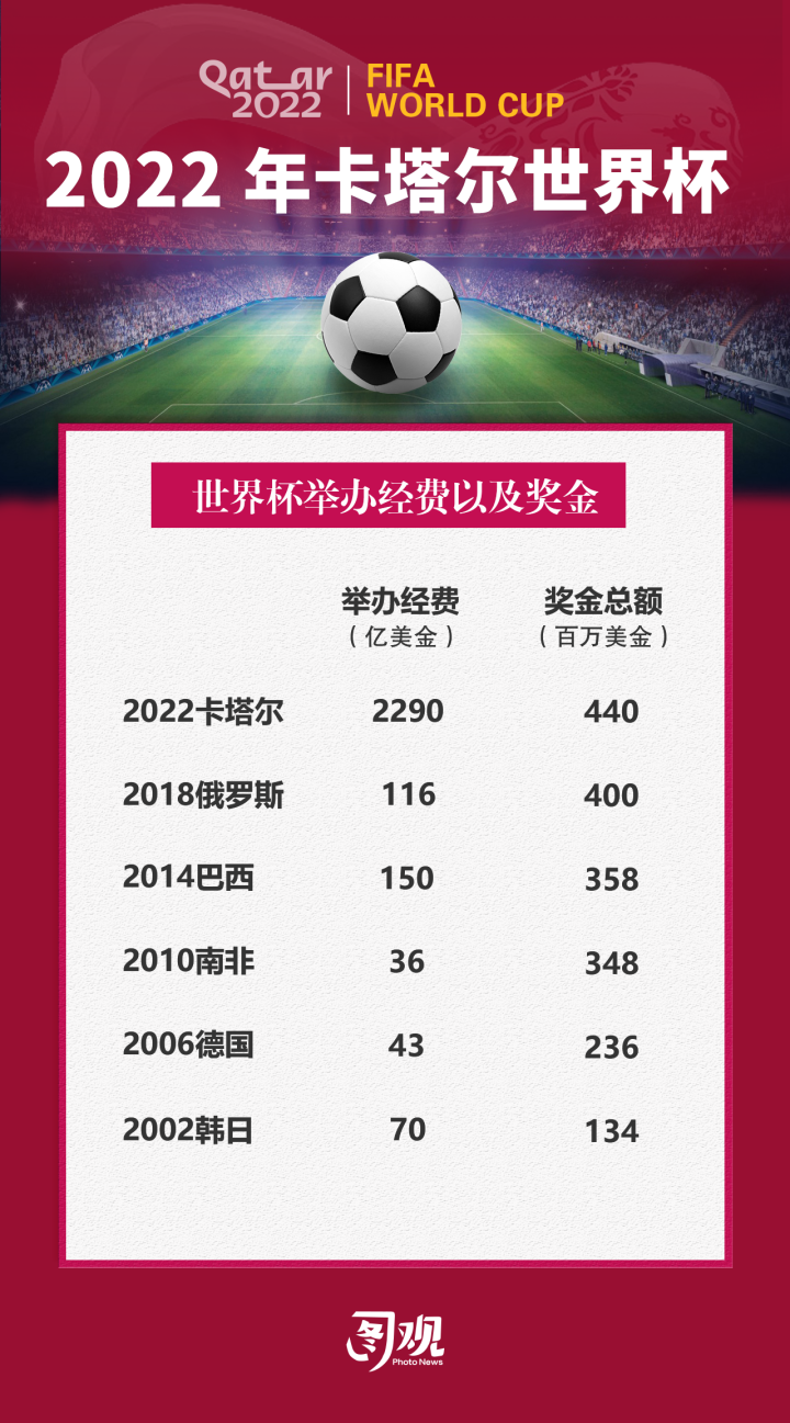 此前,2022年卡塔尔世界杯奖金方案出炉,总奖金高达4.4亿美元,是有史以来奖金池最高的一届世界杯。其中,冠军、亚军和季军分别可以拿到4200万美元、3000万美元和2700万美元。