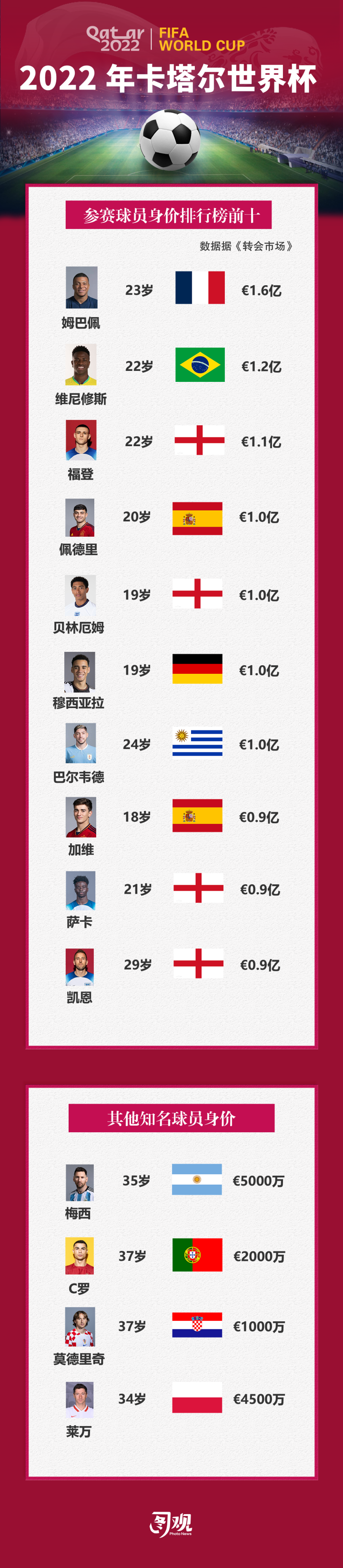 截至目前,根据德国知名足球媒体《转会市场》网站发布的数据,在参加本届世界杯的球员中,身价最高的是法国队的23岁前锋姆巴佩,转会费高达1.6亿欧元;排在第2位的是巴西队的22岁前锋维尼修斯,身价为1.2亿欧元;排在第3位的是英格兰队的中场小将22岁的福登,身价为1.1亿欧元。而目前身价最高,达1.7亿欧元的哈兰德,因为挪威队在预选赛阶段就被淘汰出局了,所以没有参加本届世界杯。