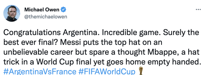 前英格兰前锋欧文在社交媒体上写道:“恭喜阿根廷。不可思议的比赛。显然是有史以来最好的决赛?梅西为他令人难以置信的职业生涯增添了新的荣誉,但看看姆巴佩,他在世界杯决赛中上演了帽子戏法,却空手而归。”