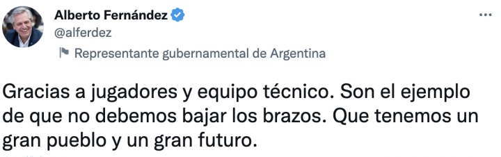 阿根廷总统费尔南德斯在社交媒体上表达了对球队的感谢。他写道:“感谢球员们和教练团队。他们是我们的榜样,他们告诉我们不能放弃,证明了我们有伟大的人民和美好的未来。”