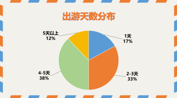 途牛旅游网发布《2023五一出游消费盘点》显示,从出游天数来看,用户4-5天行程的出游人数占比为38%;其次是2-3天的行程,出游人数占比为33%;此外,也有12%的”拼假族”选择了5天以上的出游行程。