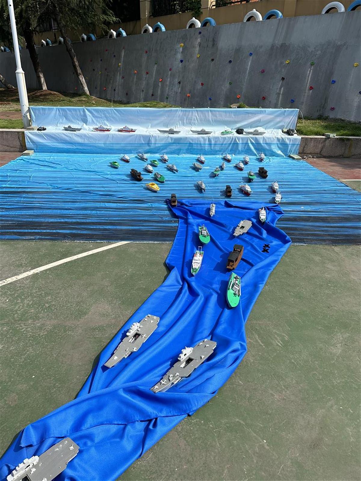 在海模展,学生们围绕在水池旁,用遥控操控着“新自由号”小船进行绕标跑。四年级(6)班学生高子骞介绍,海模展分为帆船项目、自航船和遥控船三部分,同学们可以根据自己的兴趣选择体验的种类。