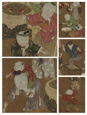 至于“打娇惜”,那是另一种搁地上旋转、用鞭子抽打的陀螺。台北故宫博物院还藏有一幅传为苏汉臣的《婴戏图》,图像下端,那两名孩子玩的就是“打娇惜”。他们上方,有一辆制作颇为精致的玩具车;再往上看,床榻上还有三个孩子正凝神看着两个玻璃瓶,瓶中养着几尾小鱼。不要以为宋代没有玻璃瓶,宋人范成大有一首诗写道:“映光鱼隐见”,并自注:“琉璃壶瓶贮水养鱼,以灯映之。”可知宋人已经在用透明的玻璃瓶养鱼,并以灯光装饰,供人观赏。元人熊梦祥的《析津志》说,元大都中,有小商贩“以竹拴琉璃小泡,养数小鱼在内,沿街擎卖”。