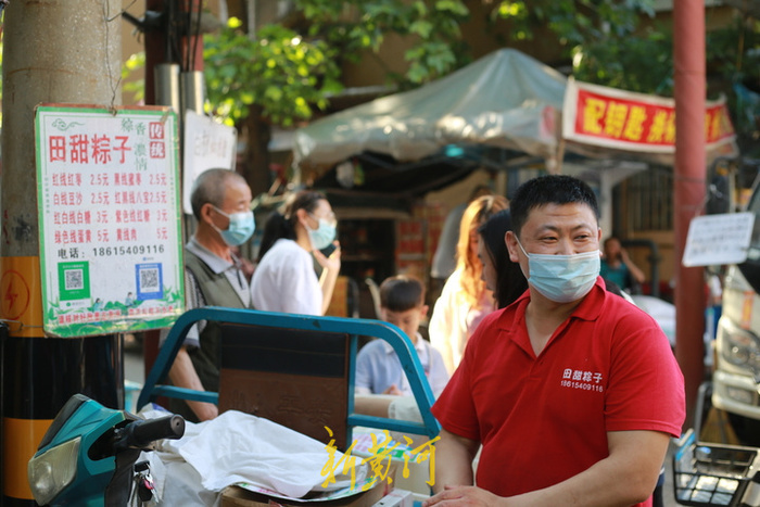 在写着“田甜粽子”的招牌前面,站着一个理着平头的中年男子,他穿着红色T恤衫,埋头在一车粽子前面。“6个红糖、6个白糖,这是你的,拿好。”他一边拿塑料袋装粽子,一边招呼着排队的顾客扫码付账,远远看去,后面顾客排起了长队,大约有二三十人,有的还拉着行李箱。