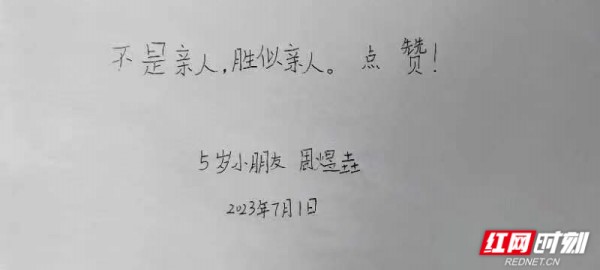 红网时刻娄底7月3日讯(见习记者韩佳根通讯员赵美艳)“谢谢各位叔叔阿姨的帮助,你们辛苦啦,再见。”列车虽已远去,但稚嫩的童音仍久久回荡在娄底火车站候车室领班钟琳的耳边。伴随着回音留下的,还有一封感谢信。信上的内容很简单:“不是亲人,胜似亲人,点赞!”落款人是一名5岁小朋友。