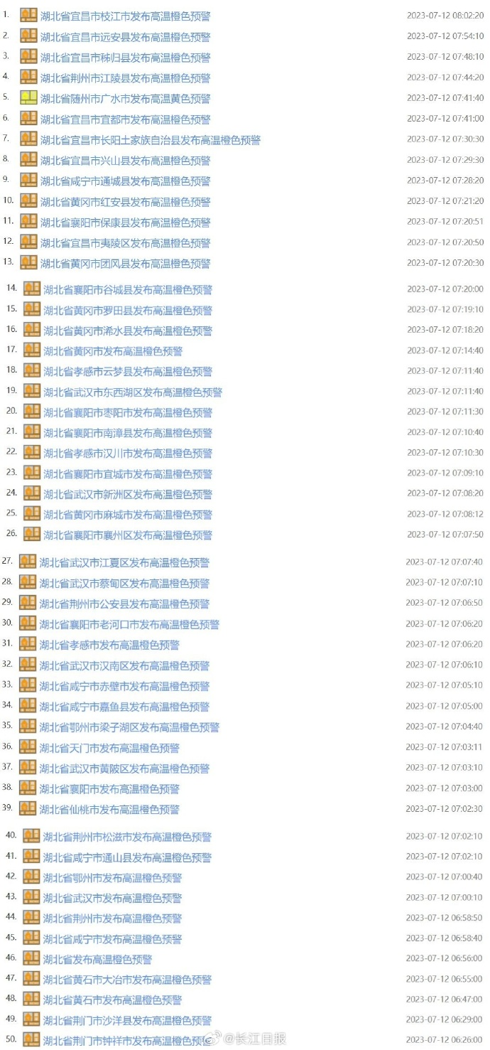 随后,武汉市气象台2023年07月12日07时00分发布高温橙色预警信号:预计今天白天,武汉大部最高气温将升至37℃以上,局部可达39℃以上,请注意防范。